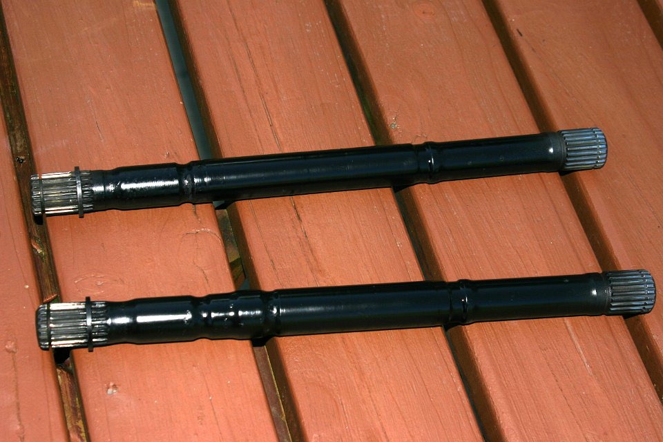 A fine pair of remanufactured drive shafts. One side Mini spline and the other side Suzuki. I painted them black.