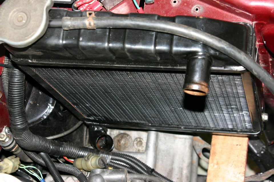Next was the somewhat important cooling of the engine. I’d been to the radiator shop to see if I could make a custom radiator or perhaps do a re-core on the Suzuki radiator. But then I rang Lee from Mini Bits and he got me a brand new radiator which I subsequently dropped off at the radiator shop to get it modified to match my application. The overflow needed to come out the other way and the bottom outlet on the radiator needed modifying as you can see on this photo. I needed to point up for a bit.